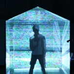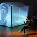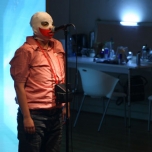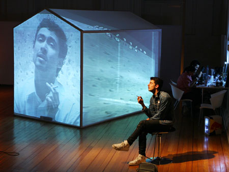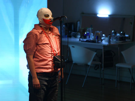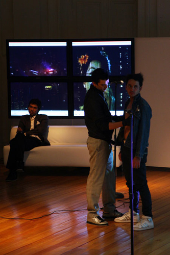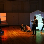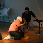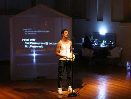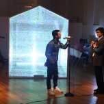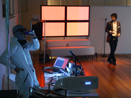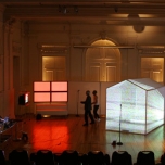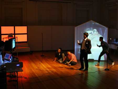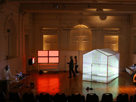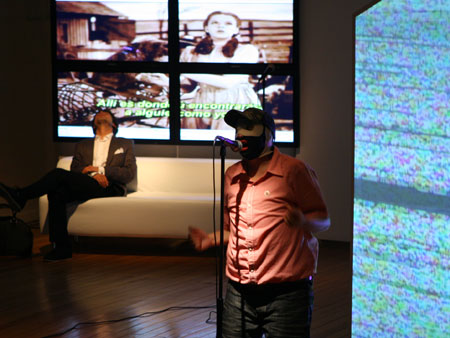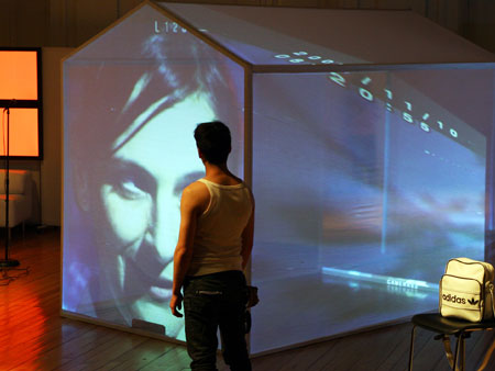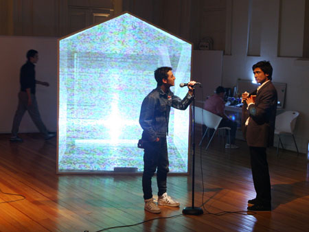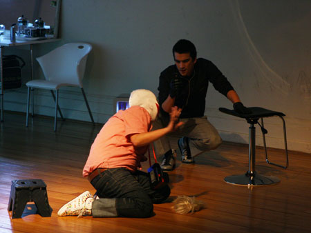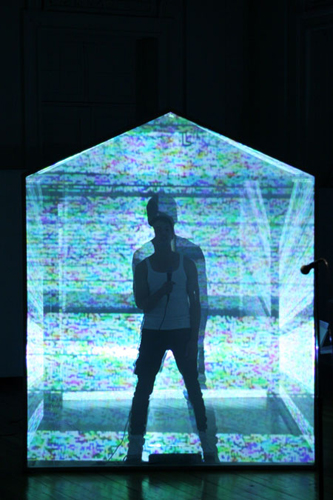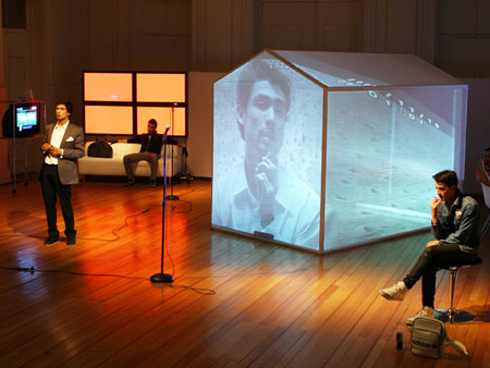 Una casa modular y translucida (pantalla tridimesional) preside el espacio, dentro de ella se proyectan con dos datashow, imágenes y secuencias del texto dramático como metarrelato. Las imágenes de la casa dialogan con una pantalla paralela de Videowall (nueve pantallas Lcd), la que está conectada a una cámara en circuito cerrado que llevara integrada a su cuerpo uno de los performers. Tres micrófonos de pedestal estarán delante del videowall y a un costado de la locación del Músico,quien está en una pequeña tarima con una mesa que le permite manipular con facilidad sus instrumentos.